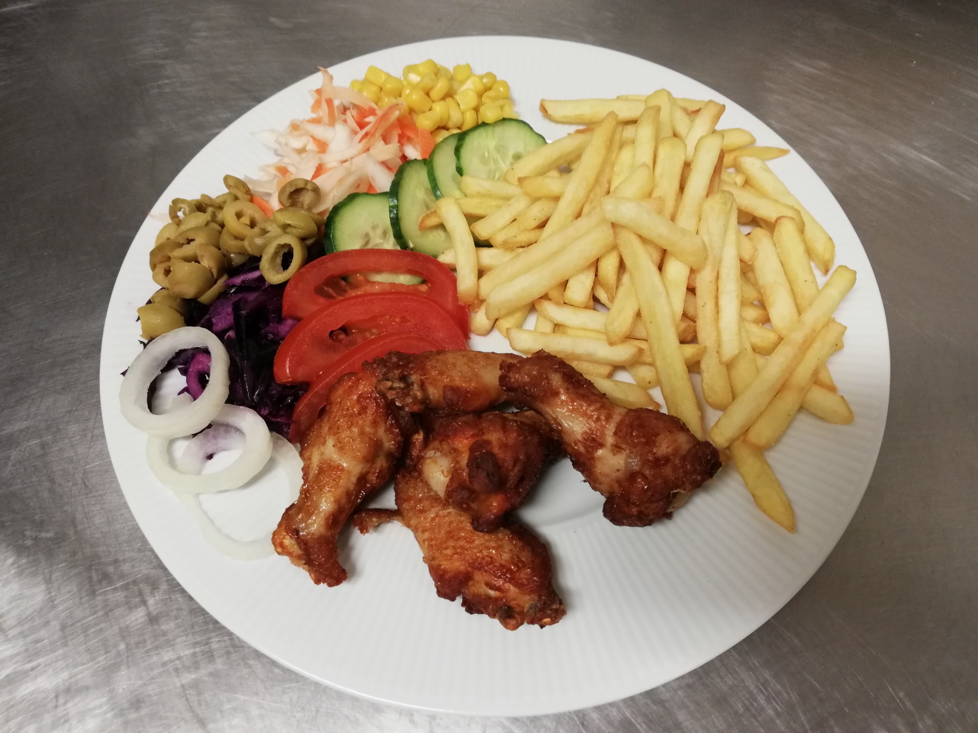 350g, kuracie mäso, zelenina, dresing, žemľa+ hranolky 150g + Coca-Cola 0,25l