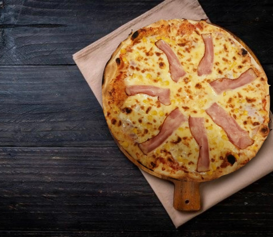 paradajkový základ, tuniak, cibuľa, kukurica, šunka, syr